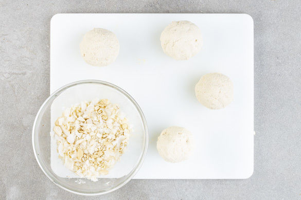Die restlichen Cashews fein hacken und mit dem Panko-Paniermehl und den Kokosflocken mischen. Aus dem Teig mit feuchten Händen 8 gleich große Portionen formen. Jede Portion in der Hand zu einer flachen Scheibe drücken und eine Pflaume darauf platzieren. Dann den Teig über der Pflaume verschließen und gut fest drücken.
