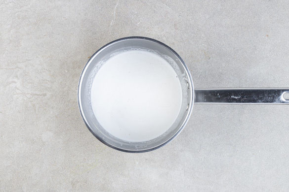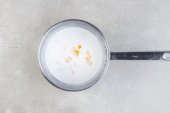 Die Sojasahne mit dem Vanillezucker und 2TL Zucker in einem kleinen Topf bei mittlerer Hitze 3–4Min. einköcheln lassen.