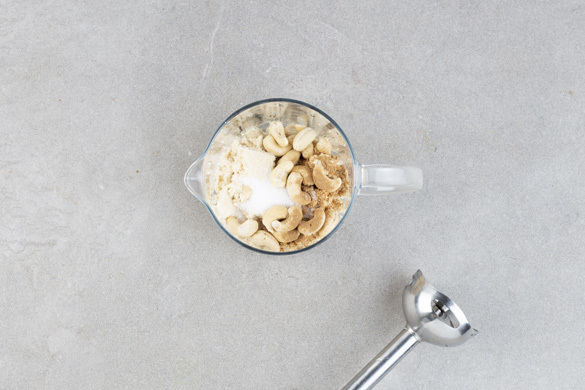 Den Backofen auf 200°C Umluft (220°C Ober-/Unterhitze) vorheizen. Den Tofu mit den Fingern zerbröseln und in ein hohes Gefäß geben. Mit ca. 2/3 der Cashewkerne, 1–2EL Zucker und 60ml Wasser mit einem Stabmixer möglichst fein pürieren. Ca. 40g Mehl hinzufügen und weiter pürieren, bis keine Klümpchen mehr vorhanden sind.