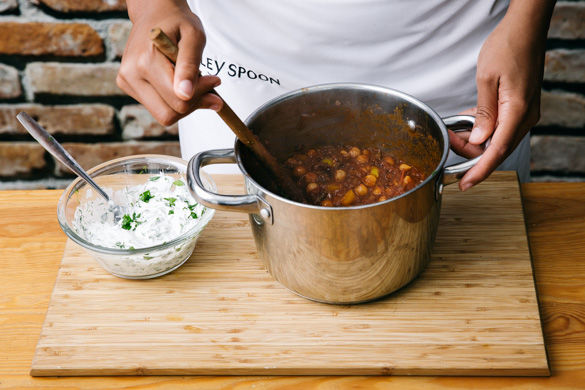 Die Kichererbsen in ein Sieb abgießen und mit den gehackten Tomaten zum Gemüse in den Topf geben, dann 400–450ml Wasser angießen und das Brühgewürz hinzugeben. Alles aufkochen lassen und mit Salz, Pfeffer und der Gewürzmischung nach Geschmack würzen. Den Eintopf 10–12Min. köcheln lassen.