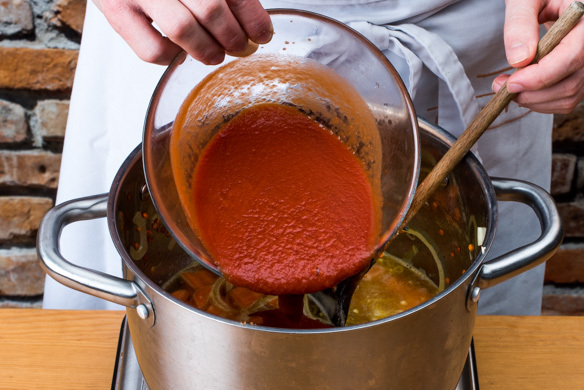 Das Gemüse mit den Linsen in einem mittelgroßen Topf bei mittlerer Hitze mit 1EL Olivenöl 2–3Min. anschwitzen. Mit den passierten Tomaten und 500ml Wasser ablöschen, das Brühgewürz unterrühren und das Karotten-Linsen-Gemüse 15–20Min. köcheln lassen oder bis die Linsen gar sind. Ggf. mehr Wasser hinzufügen.