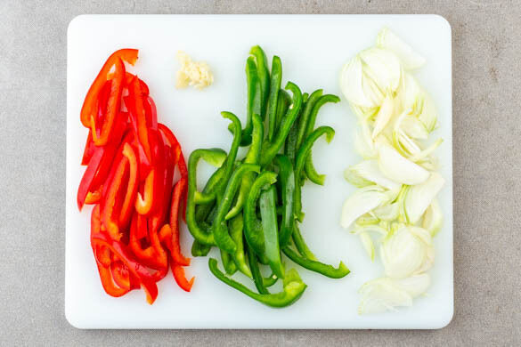 Die Paprika vierteln, entkernen und in dünne Streifen schneiden. Die Zwiebeln schälen, halbieren und in feine Streifen schneiden. Den Knoblauch schälen und sehr fein würfeln oder durch eine Knoblauchpresse drücken.