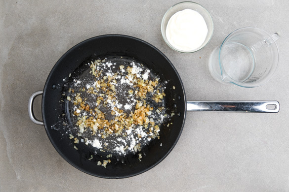 Die Zwiebeln in derselben Pfanne bei mittlerer Hitze 1–2Min. glasig anschwitzen, dann 1EL Mehl hinzufügen und unterrühren. Mit 300ml Wasser und der Crème fraîche ablöschen und die ½ des Brühgewürzes unterrühren.