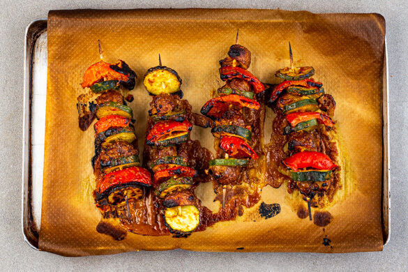 Das Gemüse abwechselnd auf 4 Schaschlikspieße ziehen. Die Spieße auf einem mit Backpapier ausgelegten Backblech verteilen und im Ofen 12–15Min. grillen, dabei gelegentlich wenden.