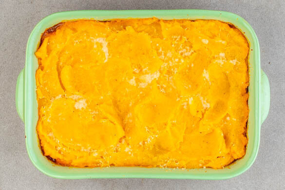 Zwei ca. 30x20cm große Auflaufformen mit je 1EL Butter einfetten, dann die Hackfleischfüllung hineingeben und das Püree darauf verteilen. Den Käse fein reiben und über das Püree streuen. Die Pies im oberen und mittleren Teil des Ofens 5–7Min. backen, bis der Käse goldbraun zerlaufen ist. Die Pies etwas abkühlen lassen und servieren.