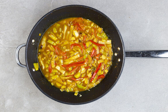 Die Paprika und den Lauch in einer großen Pfanne mit 2EL Pflanzenöl und 1 Prise Salz bei mittlerer Hitze 2–3Min. anbraten. Dann die Currypaste unterrühren und ca. 2Min. mitbraten.