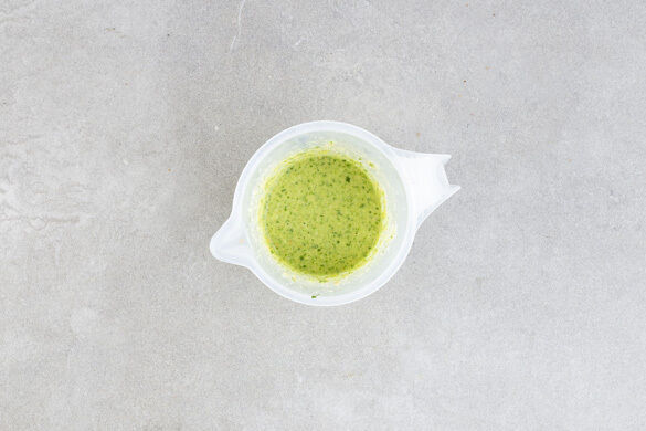 Ca. ⅔ des Korianders mit dem Ingwer, den Erdnüssen, 100ml kaltem Wasser, 2EL Pflanzenöl, 1EL Essig, 1TL Zucker und 1 kräftigen Prise Salz in einem hohen Gefäß möglichst glatt pürieren.
