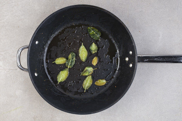 Die Salbeiblätter in der Pfanne mit 2EL Olivenöl bei starker Hitze ca. 2Min. frittieren und anschließend auf Küchenkrepp abtropfen lassen. Die Hitze auf die niedrigste Stufe reduzieren und 2EL Butter in der Pfanne schmelzen lassen.