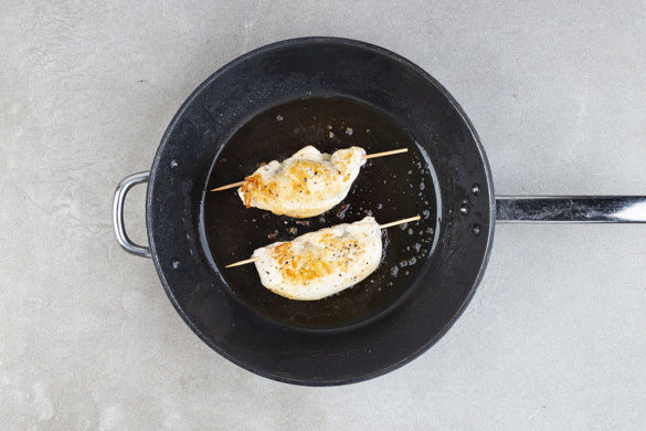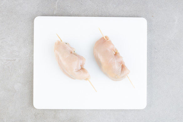 Das Fleisch mit etwas Küchenkrepp trocken tupfen und von der flachen Seite aus eine ca. 3cm tiefe Tasche einschneiden. Anschließend ca. 1cm dünn plattieren. Das Hähnchen gleichmäßig mit dem Käse und dem Spinat füllen und das Fleisch über der Füllung möglichst dicht mit den Holzspießen verschließen.