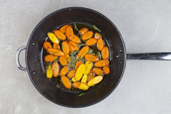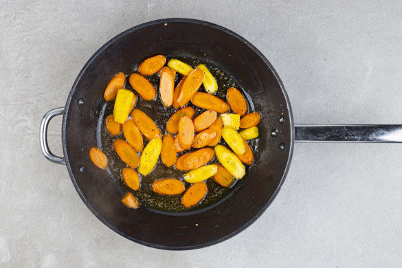 Die Karotten schälen und schräg in dünne Scheiben schneiden. In der Pfanne mit 3EL Wasser, 1/2TL Salz und der 1/2 des Honigs bei mittlerer Hitze abgedeckt in 10–12Min. weich dünsten.