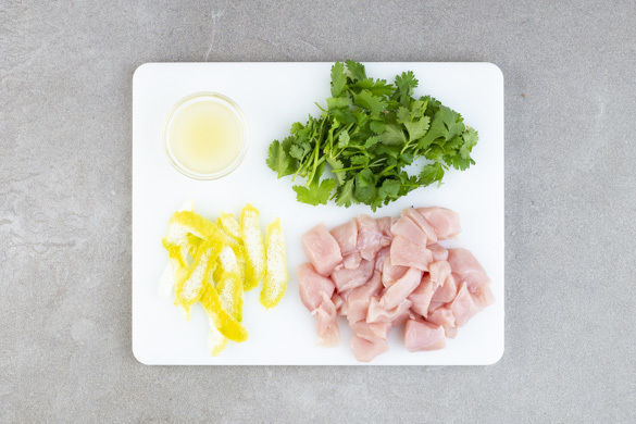 Das Fleisch mit etwas Küchenkrepp trocken tupfen und in 1–2cm große Stücke schneiden. Die Zitronenschale mit einem Sparschäler rundum dünn abschälen, dann die Zitrone halbieren und auspressen. Den Koriander samt Stängeln grob schneiden.