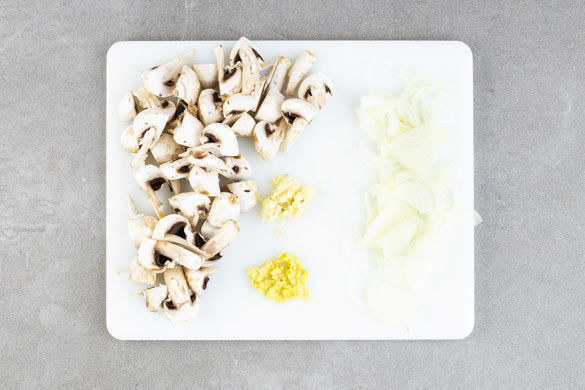 Die Champignons ggf. mit etwas Küchenkrepp oder einer Bürste säubern und je nach Größe vierteln oder achteln. Die Zwiebel schälen, halbieren und in feine Streifen schneiden. Den Knoblauch und den Ingwer schälen und fein reiben.