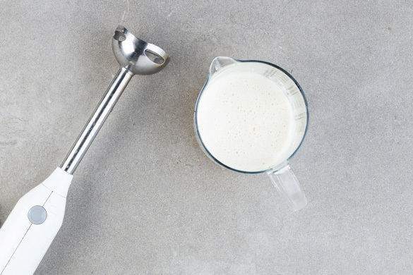 Den Knoblauch, den Ingwer und die Erdnüsse mit 250ml warmem Wasser in einem hohen Gefäß zu einer möglichst glatten Würzsauce pürieren.