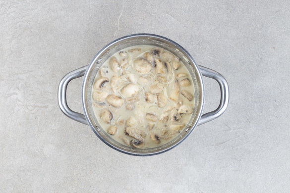 In einem weiteren mittelgroßen Topf das Fleisch mit 2–3EL Pflanzenöl bei starker Hitze 1–2Min. scharf anbraten. Den Topf vom Herd nehmen, das Fleisch mit der Würzsauce ablöschen und das Brühgewürz unterrühren. Erneut aufkochen lassen, dann den Joghurt unterrühren. Die Pilze und die Zwiebeln dazugeben und das Curry 7–8Min. sanft köcheln lassen.