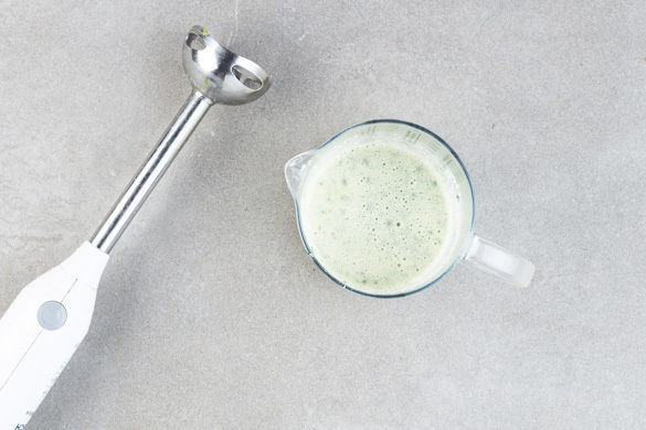 Den Knoblauch, den Ingwer und die Erdnüsse mit 500ml warmem Wasser in einem hohen Gefäß zu einer möglichst glatten Würzsauce pürieren.