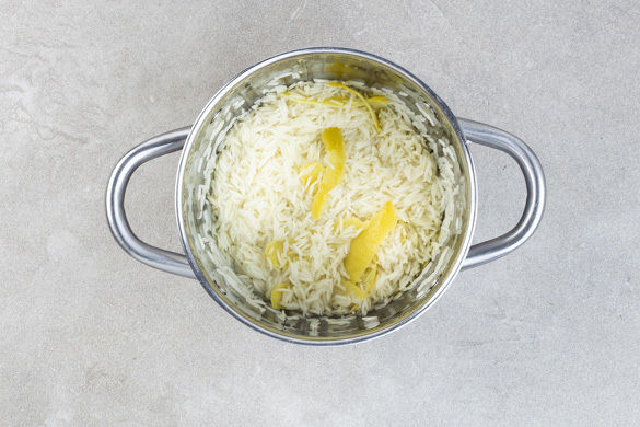 In einem mittelgroßen Topf 600ml leicht gesalzenes Wasser zum Kochen bringen. Den Reis in einem Sieb unter fließendem Wasser abspülen. Sobald das Wasser kocht, den Reis und die Zitronenschale hineingeben und bei niedrigster Hitze abgedeckt 10–12Min. kochen, bis das Wasser aufgesogen und der Reis gar ist. Noch ca. 5Min. ohne Hitzezufuhr abgedeckt ziehen lassen.