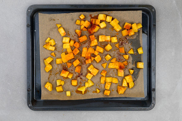 Die Zwiebel schälen, halbieren und in Streifen schneiden. Die Zwiebelstreifen mit etwas Olivenöl vermengen, auf den Kartoffelwürfeln verteilen und die restliche Backzeit mitbacken. Die Kartoffeln und die Zwiebeln gelegentlich wenden, damit sie gleichmäßig garen.