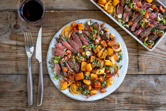 Das Chimichurri mit Salz abschmecken. Die gebackenen Kartoffeln und die Zwiebeln nach Wunsch mit dem restlichen Paprikapulver sowie Salz und Pfeffer würzen. Das Fleisch in Tranchen schneiden und Chimichurri nach Geschmack darübergeben. Die Kartoffeln dazu servieren.