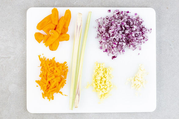 Den Backofen auf 180°C Umluft (200°C Ober-/Unterhitze) vorheizen. Die Karotten schälen, 1 1/2 Karotten schräg in dünne Scheiben schneiden, die restliche Karotte grob reiben. Die Zitronengrasstange längs halbieren. Die Zwiebeln schälen, halbieren und in feine Würfel schneiden. Den Knoblauch und den Ingwer schälen und ebenfalls fein würfeln.
