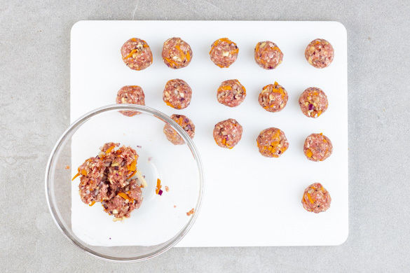 Das Hackfleisch mit der geriebenen Karotte, der 1/2 der Zwiebeln, der 1/2 des Knoblauchs, 1/4 des Ingwers oder mehr sowie Salz und Pfeffer verkneten. Mit einem Esslöffel etwa gleich große Portionen abstechen und diese mit den Händen zu 1–2cm großen Hackbällchen formen.