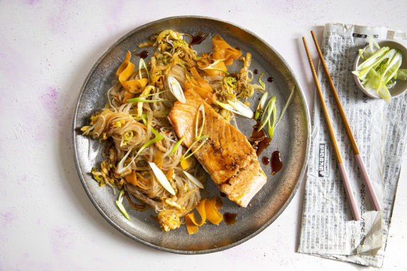 Zarter Lachs und eine würzige Nudelpfanne aus Glasnudeln, Chinakohl und Karotte sind heute zur Stelle, wenn du auf der Suche nach großem Feierabendgenuss bist. Soja- und Sriracha-Sauce, Ingwer, Knoblauch und Frühlingszwiebel sorgen dafür, dass das schnelle Gericht einfach nur richtig lecker ist. Und schnell geht es auch noch – perfekt!