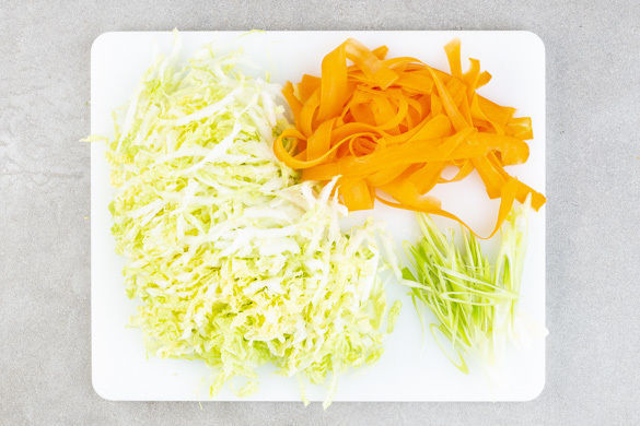 Den Chinakohl längs halbieren, dann quer in feine Streifen schneiden. Die Karotte schälen, dann mit dem Sparschäler rundum in lange, dünne Streifen schneiden. Die Lauchzwiebel in feine, längliche Ringe schneiden.