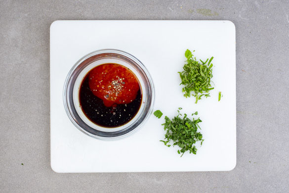 Die Minzeblätter abzupfen und grob schneiden. Die Korianderblätter von den Stängeln zupfen und grob, die Korianderstiele fein schneiden. 2EL Sojasauce oder nach Geschmack mehr mit der Sweet-Chili-Sauce, dem Ketjap Manis, 1EL Essig, 2EL Wasser sowie Pfeffer zu einer Würzsauce verrühren.