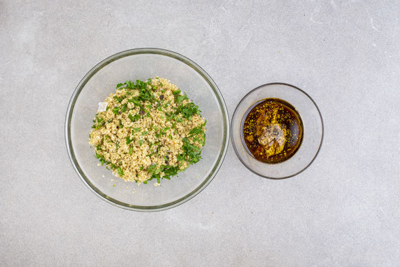 Den Senf mit dem Ahornsirup, dem restlichen Balsamicoessig, 1–2EL Olivenöl und 2–3EL Wasser verrühren und das Dressing mit Salz und Pfeffer abschmecken. Die Petersilienblätter von den Stängeln zupfen und fein hacken, die 1/2 der Petersilie unter die Quinoa mischen.