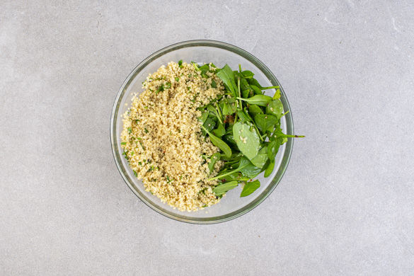 In einem kleinen Topf 350ml Wasser mit der 1/2 des Brühgewürzes zum Kochen bringen. Die Quinoa in einem feinmaschigen Sieb mit warmem Wasser abspülen, in das kochende Wasser geben und 10–12Min. abgedeckt bei niedriger bis mittlerer Hitze sanft köcheln lassen. Vom Herd nehmen, 1–2EL Olivenöl unterrühren, mit Salz und Pfeffer abschmecken und die Quinoa bis zum Servieren warm halten.