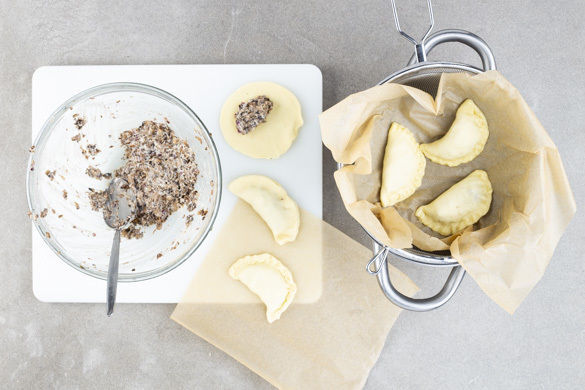 Die etwas abgekühlte Füllung mit ca. 2EL Topfen vermengen. Auf jedes Teigstück mittig 1–2TL Füllung geben und die Piroggen seitlich verschließen. Ein Sieb mit einem Stück Backpapier auslegen und die Piroggen mit etwas Abstand zueinander darauf platzieren. Das Sieb in den Topf hängen und die Piroggen abgedeckt ca. 15Min. dämpfen.