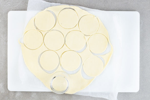 Den Teig mit dem Papier nach unten ausrollen und mit einem geeigneten Glas 6–8cm große Kreise ausstechen. In einem mittelgroßen Topf 500ml Wasser zum Kochen bringen.