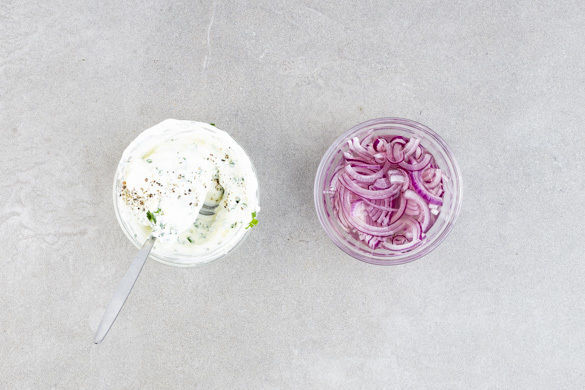 Den Knoblauch schälen und fein würfeln. Den Schnittlauch in feine Röllchen schneiden und mit dem Knoblauch unter den restlichen Topfen rühren. Den Dip mit Salz und Pfeffer abschmecken. Die Zwiebelstreifen mit 50ml heißem Wasser, 1EL Essig und je 1TL Zucker und Salz verrühren und ziehen lassen.