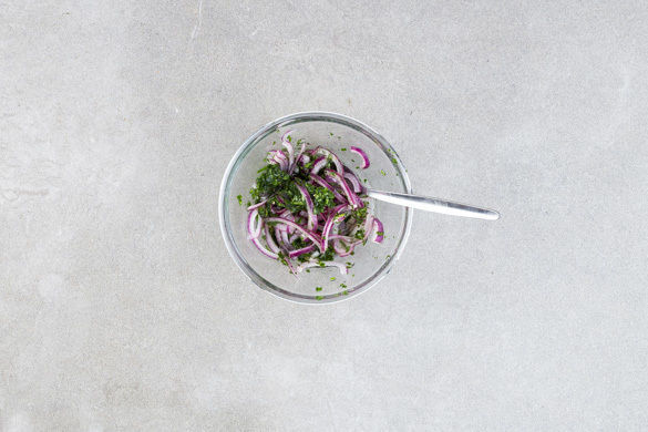 Die Petersilienblätter abzupfen und fein hacken. Die Zwiebelstreifen abtropfen lassen und mit der Petersilie vermengen. Aus 2–3EL Olivenöl, 1–2EL Essig sowie Salz, Pfeffer und Zucker ein Dressing anrühren.