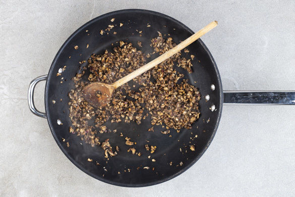 Die Pilze ggf. säubern und fein hacken. Die Zwiebeln schälen und halbieren, zwei Hälften in feine Würfel, die übrigen Hälften in dünne Streifen schneiden. Die 1/2 der Walnüsse fein hacken und mit den Pilzen und den Zwiebelwürfeln in einer mittelgroßen Pfanne mit 1–2TL Olivenöl bei mittlerer Hitze ca. 5min. anbraten. Mit Salz und Pfeffer würzen.