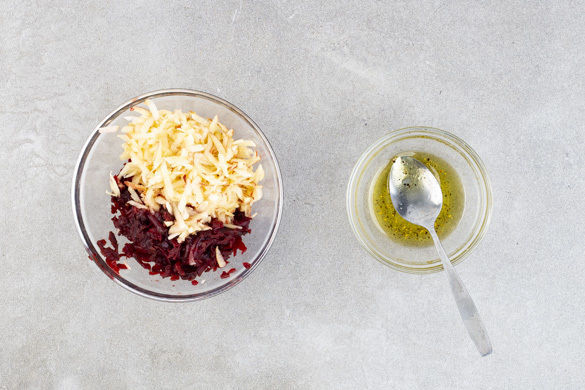 Die Rote Bete grob raspeln, dabei am besten Handschuhe und Schürze tragen. Die Äpfel ebenfalls grob reiben, das Kerngehäuse aussparen. Die Rote-Bete- und die Apfelraspel mit dem Dressing vermengen. Die Piroggen mit dem Salat und dem Kräutertopfen anrichten, mit den restlichen Walnüssen und den Petersilien-Zwiebeln garnieren und servieren.