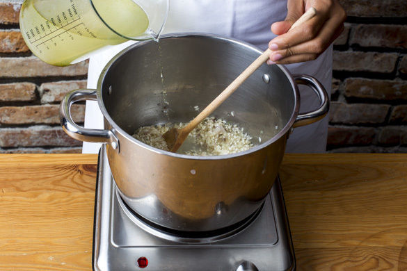 Die Schalotten in einem großen Topf mit 1EL Olivenöl und 1 Prise Salz bei mittlerer Hitze 1Min. anschwitzen. Den Reis dazugeben und 1–2Min. anrösten, dann nach und nach mit etwas Brühe begießen. Kontinuierlich rühren, bis der Reis die Flüssigkeit aufgenommen hat, erst dann wieder Brühe nachgießen. Den Vorgang wiederholen, bis die Brühe aufgebraucht und der Reis gar ist.
