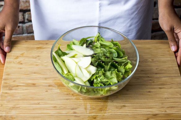 Die Äpfel vierteln, entkernen und in hauchdünne Scheiben schneiden. Die Pinienkerne in einer kleinen Pfanne ohne Zugabe von Fett 2–3Min. anrösten und mit den Apfelscheiben und dem gemischten Salat vermengen.
