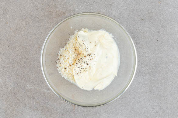 Den Käse grob reiben. Die Zitrone halbieren und auspressen. Die Crème fraîche mit der ½ des Käses, 1TL Zitronensaft und je 1 kräftigen Prise Salz und Pfeffer verrühren.