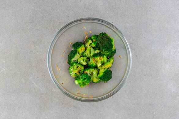 In einem mittelgroßen Topf ausreichend gesalzenes Wasser für den Brokkoli zum Kochen bringen. Den Brokkoli in mundgerechte Röschen schneiden, in das kochende Wasser geben und bei mittlerer bis starker Hitze 3–5Min. kochen, bis er strahlend grün und bissfest ist. In ein Sieb abgießen und abtropfen lassen.