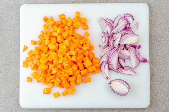 Inzwischen die Zwiebeln schälen und halbieren, dann 3 Zwiebelhälften in feine Streifen schneiden. Die Süßkartoffel schälen und in ca. 1cm große Würfel schneiden.