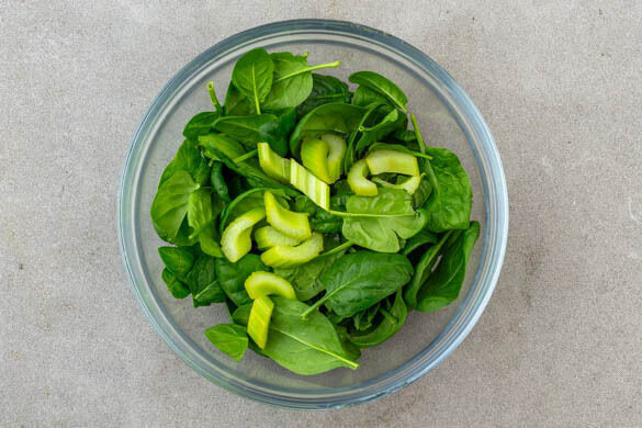 2EL Olivenöl, 2EL Sellerie-Lake, 1TL Senf und 1TL Honig zu einem Dressing verrühren. Den Sellerie in einem Sieb abtropfen lassen, dann mit dem Dressing und dem Spinat untermengen. Die Flammkuchen nach Belieben in Stücke schneiden und mit dem Sellerie-Spinat-Salat anrichten und servieren.