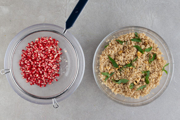 Den Granatapfel halbieren und über einer mit Wasser gefüllten Schüssel aufbrechen. Die Granatapfelkerne unter Wasser aus den Fruchtwänden und Häutchen lösen. Die schwimmenden Häutchen mit einem Löffel abschöpfen, dann die gepulten Granatapfelkerne in ein Sieb abgießen. Die restliche Minze und ⅔ des Dressings unter die Quinoa mengen.