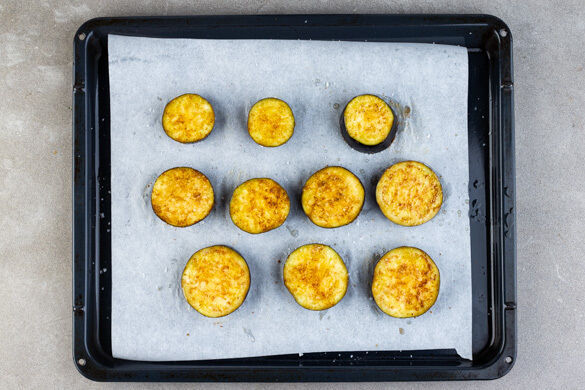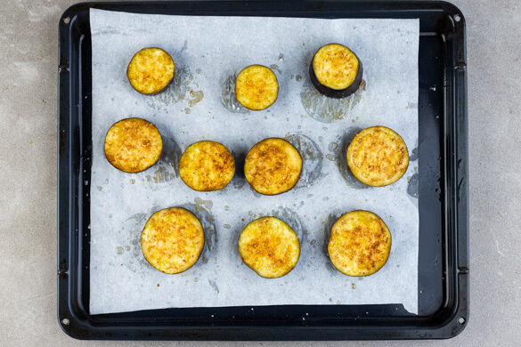 Den Backofen mit Grillfunktion oder Ober-/Unterhitze auf 230°C vorheizen. Die Auberginen in ca. 1cm dicke Scheiben schneiden, auf einem mit Backpapier ausgelegten Backblech verteilen und mit der Gewürzmischung einreiben.