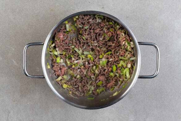 In einem kleinen Topf ausreichend Wasser für die Eier zum Kochen bringen. Den Lauch längs halbieren und quer in dünne Streifen schneiden. Die Lauchstreifen und das Hackfleisch in einem mittelgroßen Topf mit 1EL Pflanzenöl sowie je 1 Prise Salz und Pfeffer bei mittlerer bis starker Hitze 4–5Min. anbraten, bis das Hackfleisch krümelig und fast gar ist.