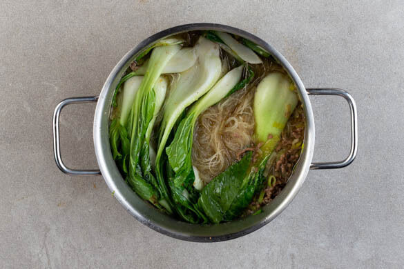 Den Pak Choi längs halbieren und den harten Strunk entfernen. Mit den Glasnudeln in die Suppe geben und abgedeckt bei niedriger Hitze in 2–3Min. weich garen. Den Topf vom Herd nehmen, dann die Suppe mit Salz und Pfeffer sowie 2TL Essig abschmecken. Tipp: Wer mag, kann statt Essig auch Fischsauce verwenden.