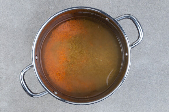 In einem mittelgroßen Topf 1L Wasser zum Kochen bringen. Die Linsen, die ½ des Bulgurs und 1 kräftige Prise Salz in das kochende Wasser geben und die Linsen und den Bulgur in ca. 15Min. gar kochen. Der restliche Bulgur wird für dieses Rezept nicht benötigt.