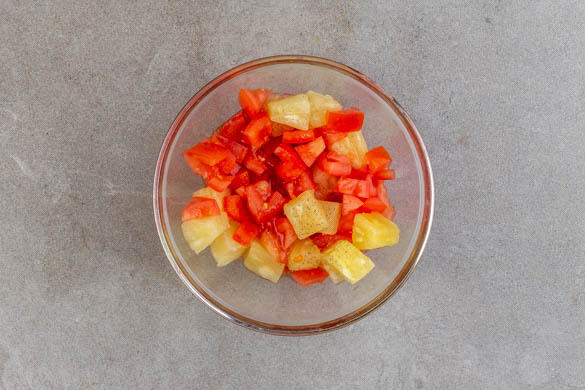Die ½ der Ananas in ein Sieb abgießen. Die Tomaten mittelfein würfeln. Die Limettenschale abreiben, dann die Limette halbieren und auspressen. Die Ananas und die Tomaten mit der ½ des Limettensafts vermengen. Mit Salz und Pfeffer abschmecken und bis zum Servieren ziehen lassen.