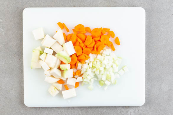 In einem kleinen Topf 300ml leicht gesalzenes Wasser zum Kochen bringen. Den Reis in einem Sieb kalt abspülen, bis das Wasser klar bleibt. Die Zwiebel schälen und grob würfeln. Die Karotte ggf. schälen, längs halbieren und in dünne Scheiben schneiden. Den Kohlrabi schälen und in ca. 2cm große Würfel schneiden.