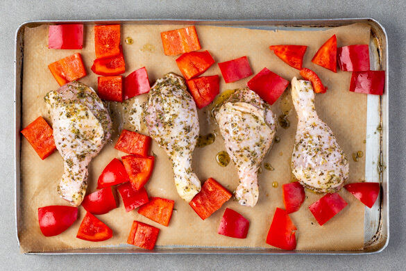 Die Drumsticks und die Paprika auf einem mit Backpapier ausgelegten Backblech verteilen und im Ofen 35–40Min. backen, bis das Fleisch goldbraun und gar ist. Nach der Hälfte der Zeit wenden.
