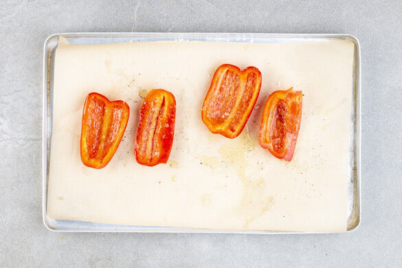 Den Backofen auf 240°C (220°C Umluft) vorheizen. Die Paprika vierteln und entkernen. Auf einem mit Backpapier ausgelegten Backblech mit 2TL Olivenöl beträufeln, mit 1 kräftigen Prise Salz bestreuen und 12–15Min. im Ofen rösten.